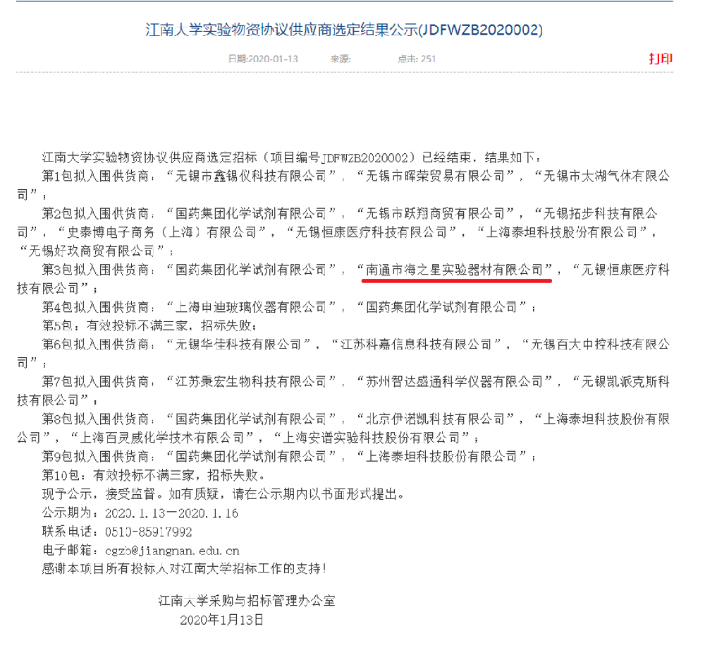 江南大學(xué)實(shí)驗(yàn)物資協(xié)議供應(yīng)商選定結(jié)果公示(JDFWZB2020002)